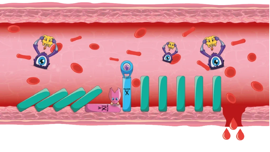 Hemlibra sticks to two clotting factors, factor IXa (activated factor 9) and factor X (factor 10).