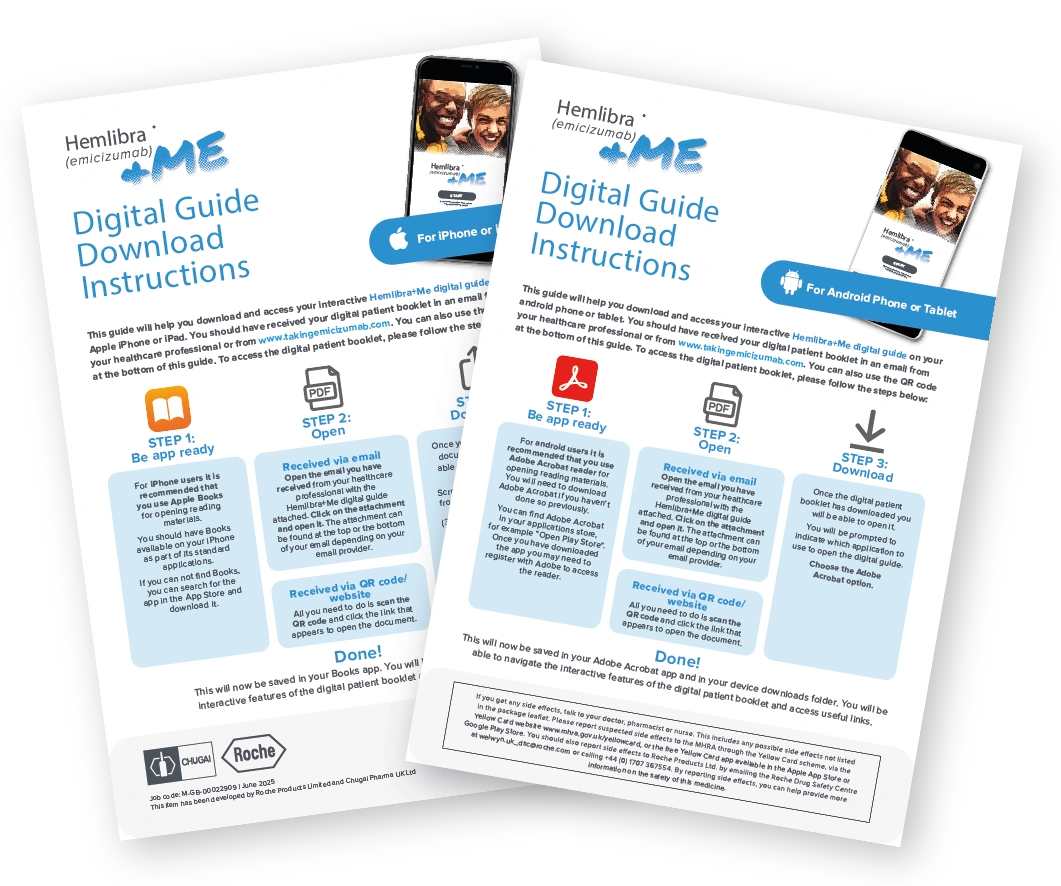 These instructions will help you download a digital interactive version of the Hemlibra + Me Guide on your Apple iPhone or iPad or android phone or tablet.